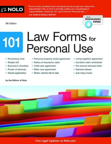 101 Law Forms for Personal Use gives you forms and stepbystep instructions to cover the legal issues you're most likely to face every day.. bills of sale for buying and selling personal property. promissory notes for lending and borrowing money. a basic will form and general power of attorney form. contracts for inhome child care. authorizations for when your children are in the care of others. releases to settle disputes. powers of attorney. contracts for home repair and remodeling. and much, much moreThis edition is completely updated for accuracy and ease of use, and now provides a power of attorney for real estate, security agreement and identifytheft worksheet. With Downloadable Forms