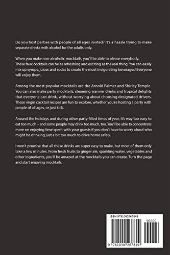 Do you host parties with people of all ages invited? Its a hassle trying to make separate drinks with alcohol for the adults only. When you make nonalcoholic mocktails, youll be able to please everybody. These faux cocktails can be as refreshing and exciting as the real thing. You can easily mix up syrups, juices and sodas to create the most invigorating beverages! Everyone will enjoy them. Among the most popular mocktails are the Arnold Palmer and Shirley Temple. You can also make party mocktails, steaming warmer drinks and tropical delights that everyone can drink, without worrying about choosing designated drivers. These virgin cocktail recipes are fun to explore, whether youre hosting a party with people of all ages, or just kids. Around the holidays and during other partyfilled times of year, its way too easy to eat too much and some people may drink too much, too. Youll be able to concentrate more on enjoying time spent with your guests if you dont have to worry about who might be drinking just a bit too much to drive home safely. I wont promise that all these drinks are super easy to make, but most of them only take a few minutes. From fresh fruits to ginger ale, sparkling water, vegetables and other ingredients, youll be amazed at the mocktails you can create. Turn the page and start enjoying mocktails.