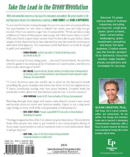 Take the Lead in the Green RevolutionWith environmental concerns a top issue for consumers everywhere, the green market is the next big boom industry for entrepreneurs looking to make moneyand make a difference."Kermit is wrong! It's easy being green...just read Croston's book. He provides a terrific guide to an amazing array of business ecoopportunities, and tells you how to take advantage of them!"Ray Smilor, Executive Director, Beyster Institute at the Rady School of Management at UC San Diego, author of Daring Visionaries: How Entrepreneurs Build Companies, Inspire Allegiance, and Create Wealth"75 Green Businesses gets you quickly up to speed on the fastpaced trends propelling the green economy and shows you where to find the opportunities. If you're considering starting your own green business, Croston's book has practically written about half your business plan for you. A terrific resource."Josh Dorfman, founder & CEO, Vivavi and author of The Lazy Environmentalist"Browsing through these pages will inspire some directly toward a new career and prompt others to invent new business models. Expect to see a dogeared copy sitting on every shelf of the next generation of entrepreneurs."Eric Corey Freed , Principal, organicARCHITECT and author ofGreen Building & Remodeling for Dummies"The biggest opportunities of the 21st century are green businesses. This wonderful book offers people who want to get involved a very comprehensive listing of those many opportunities as well as numerous links to more information. Read it and get inspired."Greg Pahl, author of The CitizenPowered Energy Handbook: Community Solutions to a Global CrisisDiscover 75 green startup ideas in multiple industries, including ecotourism, small wind power, green schools, water conservation landscaping, green investment consulting and more. For each business, Croston shows you the market, product to be delivered, resources needed, major hurdles ahead, competitors and strategies for success.