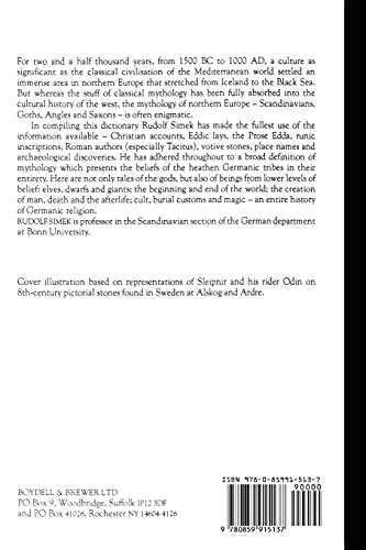 Over 1700 entries cover mythology and religion of heathen Germanic tribes: Scandinavians, Goths, Angles and Saxons, 1500 BC1000 AD.For two and a half thousand years, from 1500 BC to AD 1000, a culture as significant as the classical civilisation of the Mediterranean world settled an immense area in northern Europe that stretched from Iceland to the Black Sea.But the sources of our knowledge about these societies are relatively few, leaving the gods of the North shrouded in mystery.In compiling this dictionary Rudolf Simek has made the fullest possible use of the information available Christian accounts, Eddic lays, the Elder Edda, runic inscriptions, Roman authors (especially Tacitus), votive stones, place names and archaeological discoveries. He has adhered throughout to a broad definition of mythology which presents the beliefs of the heathen Germanic tribes in their entirety: not only tales of the gods, but beings from lower levels of belief: elves, dwarfs and giants; the beginning and end of the world; the creation of man,death and the afterlife; cult, burial customs and magic an entire history of Germanic religion.RUDOLF SIMEK is Professor of Medieval German and Scandinavian literature at the University of Bonn in Germany.