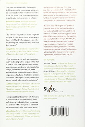 Education partnerships are central to and often a requirement of most education reform initiatives promoted by state and local governments, by foundations, and by business funders. Many fail for failure to understand the dynamics of their complex relationships.This book provides insights and guidance to enable prospective and existing education partners to develop answers to the questions that are critical to success: Why engage in this partnership? How can you communicate the potential benefits of partnership to motivate teachers, faculty, administrators, and community members? How do you select the best organizational structure and procedures for a partnership? How can you maintain open, deliberative discussion while respecting different histories and cultures? How can you produce compelling evidence that the partnership is worthwhile? Based on their observation of a fiveyearlong publicly funded partnership, research data, and the literature, the authors identify the principles that they consider critical to answering these questions. The authors do not minimize the differences and complexities inherent in partnership work, because they believe that doing so would be to present coherence and homogeneity where none exists. Instead, they seek to make evident how these principles underlie many different partnership situations. Thus, rather than presenting a package of best practices, or a cookiecutter approach, this book presents the organizational principles for planning and implementing education partnerships, along with sets of strategies for working through them. The authors present the diagnostic tools for undertaking a deliberate and researchbased approach to planning, designing, and managing a partnership. By surfacing participants oftendiffering motivations, and the practices and assumptions they bring to the table, the book provides the foundation for developing a constructive relationship. In scope, the book extends beyond schooluniversity partnerships to include schools collaboration with state and local governments, nonprofit organizations, and the business sector.
