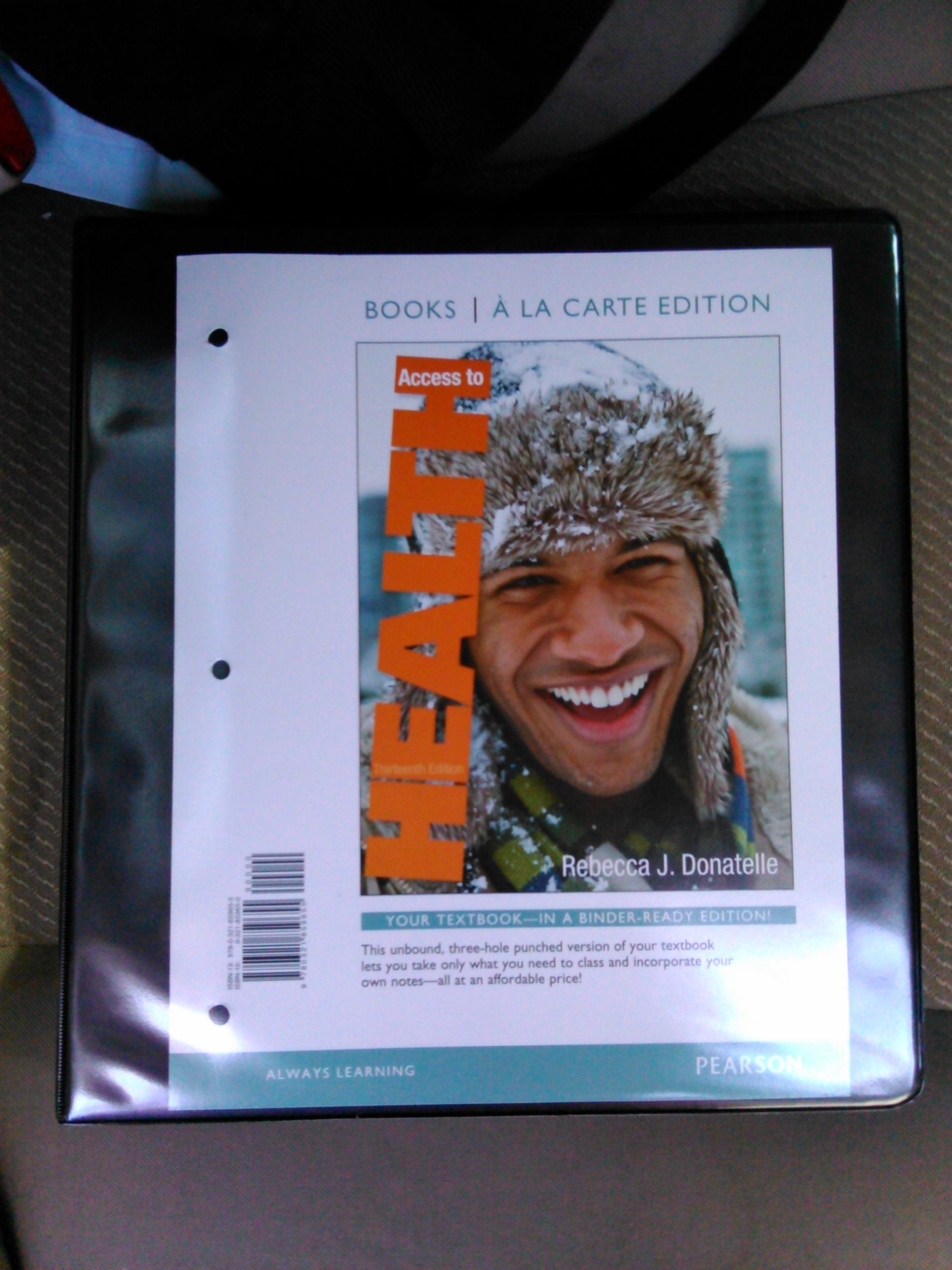 This edition features the exact same content as the traditional text in a convenient, threeholepunched, looseleaf version. Books a la Carte also offer a great value for your studentsthis format costs 35% less than a new textbook.The Thirteenth Edition of Access to Health makes personal health engaging for students to learn and easier for instructors to teach by focusing on the most important realworld issues and topics, highlighting a focus on technology and money.Long known for its currency, research, and strength in behavior change, Access to Health provides key information through a consistent framework for motivating you to make healthy life choices. As a teacher, mentor, and researcher, Rebecca J. Donatelle knows the issues that are important to todays students. Through her friendly writing style she addresses your concerns and teaches them to be savvy and critical consumers of health information.The Thirteenth Edition adds new features highlighting health topics centering around money and technology issues. Additionally, the book references one Video Tutor per chapter with QR codes. You simply scan the code with a reader on their phone and quickly and easily view a short video that makes a tricky concept easy to understand. As always, the books attractive design, imaginative art, unique minichapters, and robust media make learning personal health more accessible.Access to Health provides handson practical tools that help you effect healthy changes in your life.