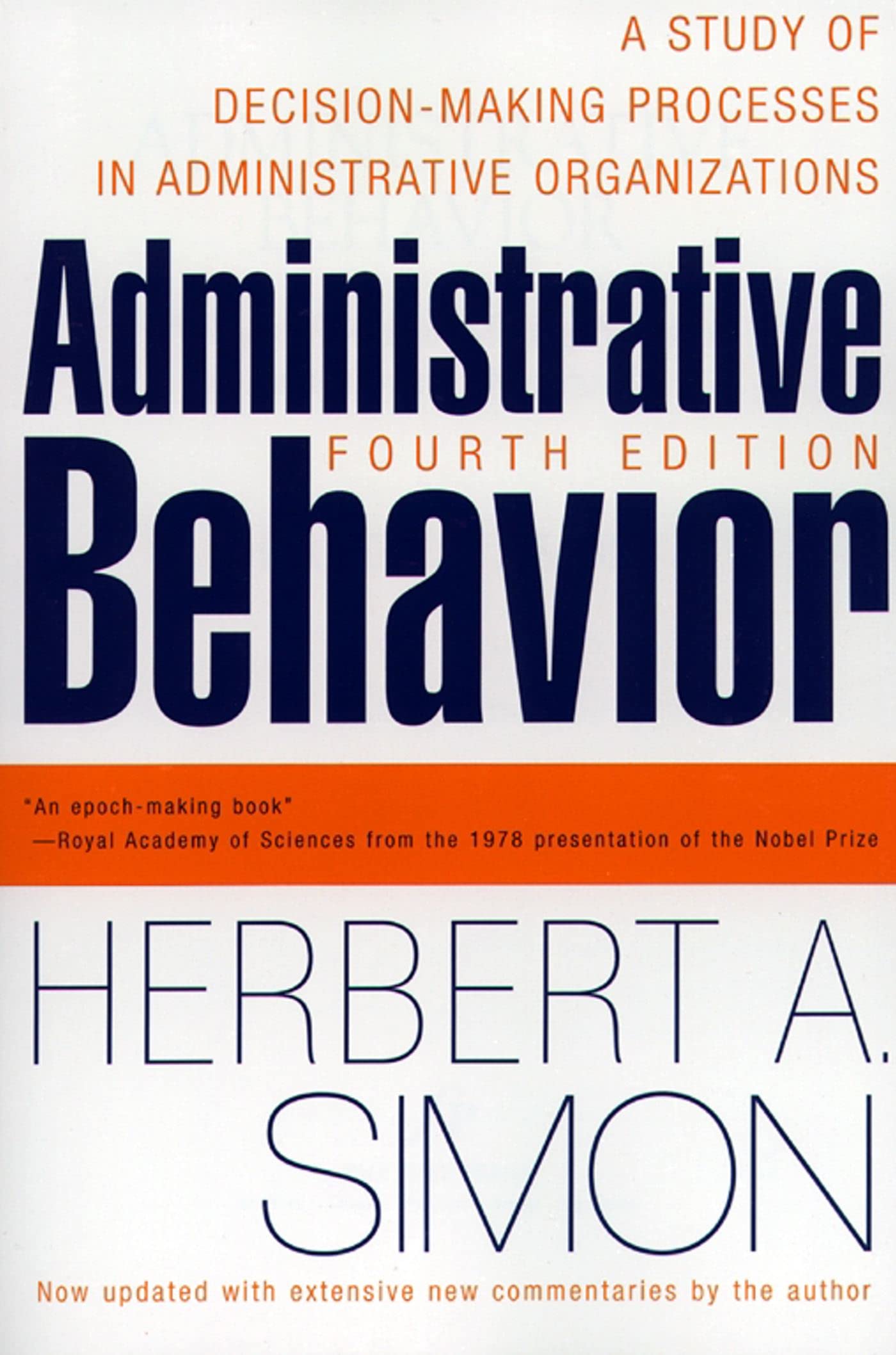 In This Fourth Edition Of His Groundbreaking Work, Herbert A. Simon Applies His Pioneering Theory Of Human Choice And Administrative Decisionmaking To Concrete Organizational Problems. To Commemorate The Fiftieth Anniversary Of The Book'S Original Publication, Professor Simon Enhances His Timeless Observations On The Human Decisionmaking Process With Commentaries Examining New Facets Of Organizational Behavior. Investigating The Impact Of Changing Social Values And Modem Technology On The Operation Of Organizations, The New Ideas Featured In This Revised Edition Update A Book That Has Become A Worldwide Classic.Named By Public Administration Review As 'Book Of The Half Century,' Administrative Behavior Is Considered One Of The Most Influential Books On Social Science Thinking, And Was Referred To By The Nobel Committee As 'Epochmaking.'Written For Managers And Other Professionals Who Wish To Understand The Decisionmaking Processes At The Heart Of Organization And Management, It Is Also Essential Reading For Students In Business And Management, Economics, Sociology, Psychology Computer Science, Government, And Law.