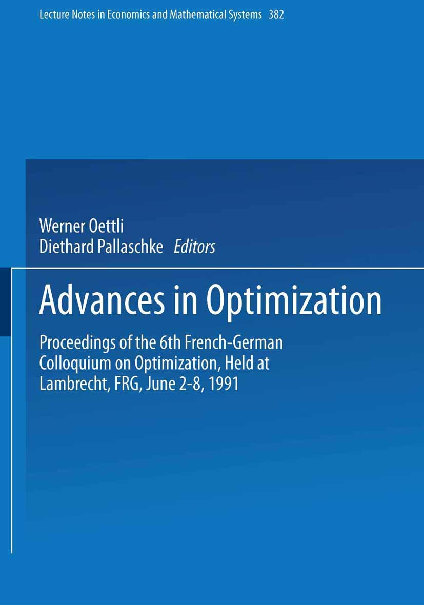 This volume contains the Proceedings of the Sixth FrenchGerman Conference on Optimization, which took place in June 1991 at Lambrecht (PfaIz). About one hundred scientists, mainly from France and Germany, but also from other european countries, met at the Palatinate Conference Center in the heart of the beautiful palatinate national park to review and discuss recent developments in the field of optimization. More than sixty lectures were delivered, covering a large part of the theoretical and practical aspects of optimization. They all contributed to a stimulating scientific exchange during the meeting. This conference was the sixth in a series which started in 1980. Proceedings of the previous FrenchGerman Conferences on Optimization have been published as follows: First Conference (Oberwolfach 1980): Optimization and Optimal Control, edited by A. Auslender, W. Oettli and J. Stoer (Lecture Notes in Control and Information Sciences, 30). Springer Verlag, Berlin and Heidelber. e;, 1981 Second Conference (Confolant, 1981): Optimization, edited by J. B. HiriartUrruty, W. Oettli, J. Stoer (Lecture Notes in Pure and Applied Mathematics, 86). Marcel Dekker, New York and Basel1983 Third Conference (Lnminy, 1984): Third FrancoGerman Conference in Optimization, edited by C. Lemarechal. Institut National de Recherche en Informatique et en Automatique, Rocquencourt, 1984 (ISBN 2726104029) Fourth Conference (Irsee, 1986): Trends in Mathematical Optimization, edited by K. Hoffmann, J. B. HiriartUrruty, C. Lemarechal, J. Zowe (International Series of Numerical Mathematics, 84). Birkhauser Verlag, Basel and Boston 1988 Fifth Conference (Varetz, 1988): Optimization, edited by S.