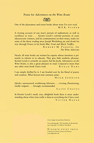 Kermit Lynch's recounting of his experiences on the wine route and in the wine cellars of France takes the reader through the Loire, Bordeaux, the Languedoc, Provence, Northern and Southern Rhone, and the Cote d'Or.