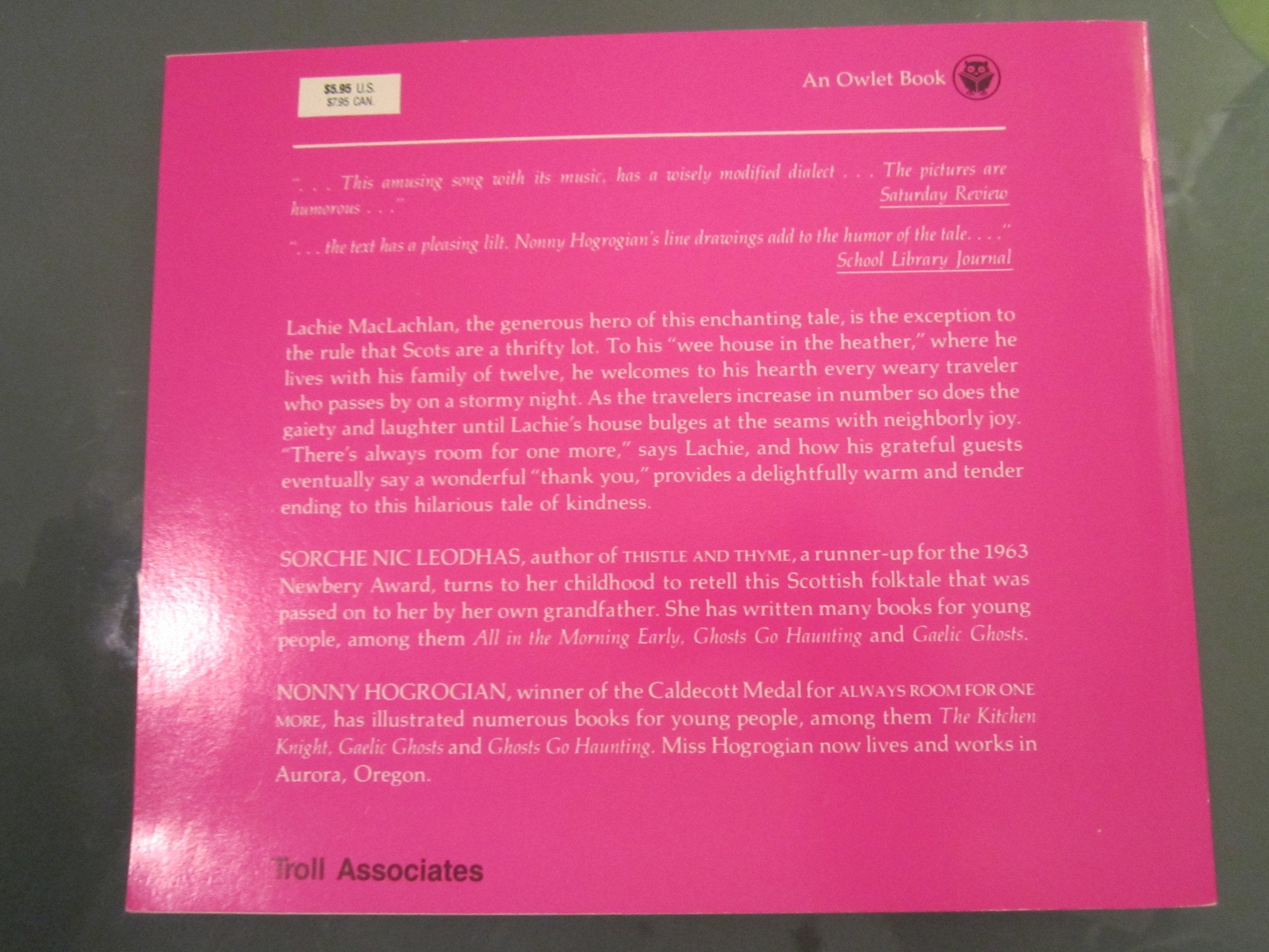 Lachie Maclachlan, The Generous Hero Of This Enchanting Tale, Is The Exception To The Rule That The Scots Are A Thrifty Lot. In His 'Wee House In The Heather,' Lachie Lives With His Family Of Twelve, And He Welcomes To His Hearth Every Weary Traveler Who Passes By On A Stormy Night. 'There'S Always Room For One More,' Says Lachie, And How His Grateful Guests Say A Wonderful 'Thank You' Provides A Delightfully Warm And Tender Ending To This Hilarious Tale Of Kindness.The Story, Derived From An Old Scottish Folk Song, Is Reflected Superbly In The Charming Illustrations Of Nonny Hogrogian. Always Room For One More Is The Winner Of The 1966 Caldecott Medal.