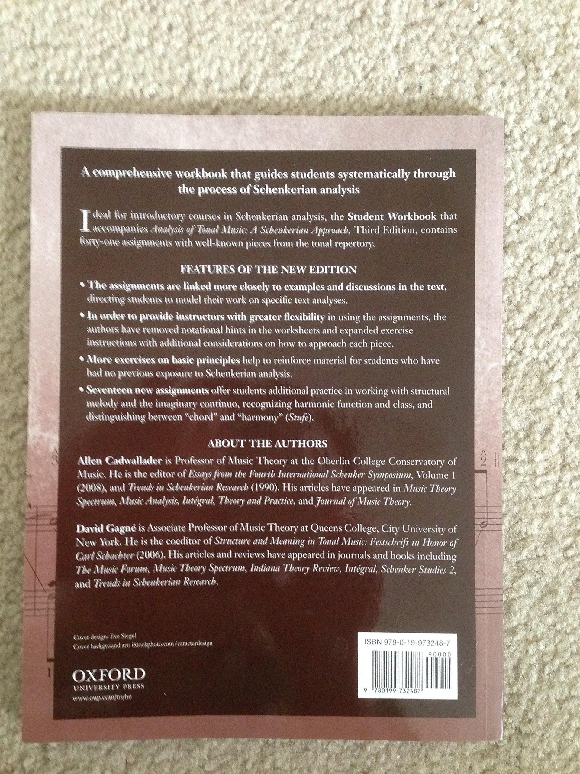 This thoroughly revised Student Workbook complements the third edition of Analysis of Tonal Music: A Schenkerian Approach and guides students systematically through the process of analysis.FEATURES* Contains fortyone assignments with wellknown pieces from the tonal repertory* Presents exercises on basic priniciples, helping to reinforce material for students who have had no previous exposure to Schenkerian analysis* Adds seventeen new assignments, offering additional practice in working with structural melody and the imaginary continuo, recognizing harmonic function, and class, and distinguishing between 'chord' and 'harmony' (Stufe)
