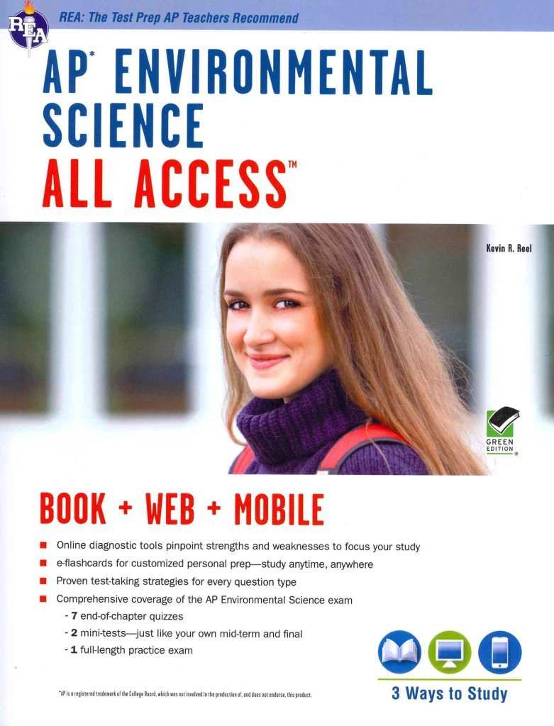 All Access for the AP Environmental Science ExamBook + Web + MobileEverything you need to prepare for the Advanced Placement exam, in a study system built around you!There are many different ways to prepare for an Advanced Placement exam. What's best for you depends on how much time you have to study and how comfortable you are with the subject matter. To score your highest, you need a system that can be customized to fit you: your schedule, your learning style, and your current level of knowledge.This book, and the online tools that come with it, will help you personalize your AP Environmental Science prep by testing your understanding, pinpointing your weaknesses, and delivering flashcard study materials unique to you.The REA AP All Access system allows you to create a personalized study plan through three simple steps: targeted review of exam content, assessment of your knowledge, and focused study in the topics where you need the most help.Here's how it works:Review the Book:Study the topics tested on the AP Environmental Science exam and learn proven AP strategies that will help you tackle any question you may see on test day.Test Yourself and Get Feedback:As you review the book, test yourself with 7 endofchapter quizzes, plus 2 minitests. Score reports from your free online tests and quizzes give you a fast way to pinpoint what you really know and what you should spend more time studying.Improve Your Score:Armed with your score reports, you can personalize your study plan. Review the parts of the book where you are weakest, and use the REA Study Center to create your own unique AP Environmental Science eflashcards, adding to the 100 free cards included with this book.Visit The REA Study Center for a suite of online tools:The best way to personalize your study plan is to get frequent feedback on what you know and what you don't. At the online REA Study Center, you can access three types of assessment: topiclevel quizzes, minitests, and a fulllength practice test. Each of these tools provides truetoformat questions and delivers a detailed score report that follows the topics set by the College Board.TopicLevel QuizzesShort, 15minute online quizzes are available throughout the review and are designed to test your immediate grasp of the topics just covered.MiniTestsTwo online minitests cover what you've studied in each half of the book. These tests are like the actual AP Environmental Science exam, only shorter, and will help you evaluate your overall understanding of the subject.FullLength Practice TestAfter you've finished reviewing the book, take our fulllength AP Environmental Science exam to practice under testday conditions. Available both in the book and online, this test gives you the most complete picture of your strengths and weaknesses. We strongly recommend that you take the online version of the exam for the added benefits of timed testing, automatic scoring, and a detailed score report.Improving Your Score: eFlashcardsWith your score reports from the quizzes and tests, you'll be able to see exactly which AP Environmental Science topics you need to review. Use this information to create your own flashcards for the areas where you are weak. And, because you will create these flashcards through the REA Study Center, you'll be able to access them from any computer or smartphone. Not quite sure what to put on your flashcards? Start with the 100 free cards included when you buy this book.This complete AP test prep package comes with a customized study schedule and expert testtaking strategies and tips.