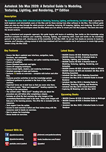 DescriptionThe Autodesk 3ds Max 2020: A Detailed Guide to Modeling, Texturing, Lighting, and Rendering book is perfect for both beginners and intermediate users of 3ds Max and for those moving from other software to 3ds Max. This brilliant guide takes you stepbystep through the whole process of modeling, texturing, UV mapping, lighting, and rendering. You will learn important concepts and techniques about 3ds Max which you can utilize to create your 3ds Max projects. This book also cover the Arnold renderer.Using a structured and pragmatic approach, this guide begins with basics of modeling, then builds on this knowledge using practical examples to enhance your modeling, texturing, lighting, and rendering skills. Each unit builds on the knowledge gained in the previous unit, showing you all the essentials of 3ds Max 2020. As you go from handson exercise to handson exercise, youll develop a strong arsenal of skills that combined will form a complete end to end process to create high quality renders using 3ds Max 2020.Key FeaturesCovers 3ds Maxs updated user interface, navigation, tools, functions, and commands.Explains the polygon, subdivision, and spline modeling techniques. Covers all modifiers. Covers Standard materials and lights. Covers UV mapping techniques. Covers Arnold lights, shaders, and rendering techniques. Detailed coverage of tools and features. Features 75 handson exercises complete with before and after files. Features practice activities to test the knowledge gained. Additional guidance is provided in the form of tips, notes, and cautions. Important terms are in bold face so that you never miss them. The content under What just happened? heading explains the working of the instructions. The content under What next? heading tells you about the procedure you will follow after completing a step(s). Includes an ePub file that contains the color images of the screenshots/illustrations used in the textbook. These color images will help you in the learning process. This ePub file is included with the resources. Tech support from the author. Access to each exercises initial and final states along with the resources used in handson exercises. Quiz to assess the knowledge. Bonus handson exercises.Brief Table of ContentsThis book is divided into following units: Unit DM1: Introduction to 3ds Max IUnit DM2: Introduction to 3ds Max IIUnit DM3: Geometric Primitives and Architectural ObjectsUnit DM4: Polygon ModelingUnit DM5: Graphite Modeling ToolsUnit DM6: Spline ModelingUnit DM7: ModifiersUnit DMB: Bonus Handson Exercises [Modeling]Unit DMP: Practice ActivitiesUnit DT1: Material EditorsUnit DT2: Standard Materials and MapsUnit DT3: Physical and Autodesk MaterialsUnit DTB: Bonus Handson Exercises [Texturing]Unit DL1: Standard LightingUnit DL2: Photometric LightsUnit DL3: Sunlight and Daylight SystemsUnit DA1: Introduction to ArnoldUnit DA2: Arnold LightsUnit DA3: Arnold Shaders and MaterialsUnit DAP: Practice Activities [Arnold]Appendix DMA: Quiz Answers [Modeling]Appendix DTA: Quiz Answers [Texturing], contains quiz answers.Appendix DLA: Quiz Answers [Lighting], contains quiz answers. Appendix DAA: Quiz Answers [Arnold], contains quiz answers.For more info, visit PADEXI ACADEMY'S website.