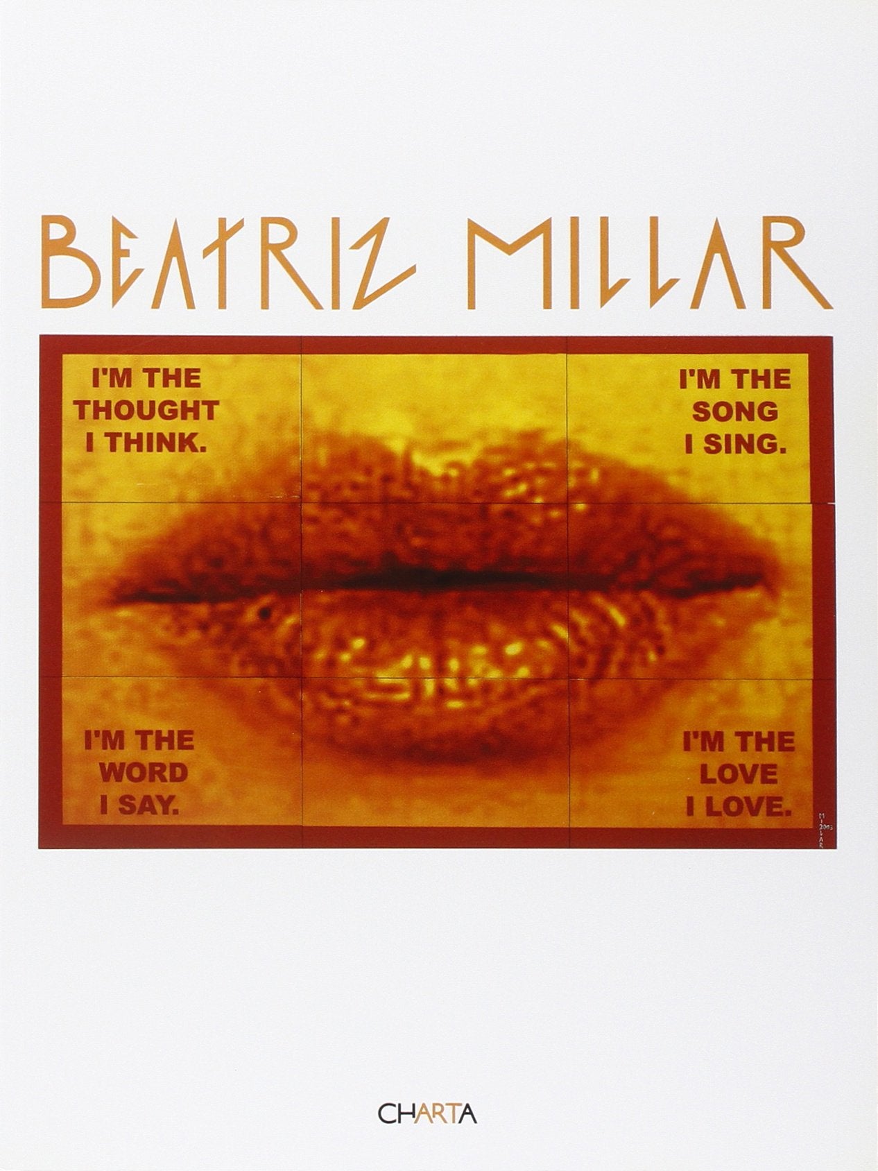 In her work, Beatriz Millar tries to eliminate any kind of redundancy or superficiality. And, by intensifying a continuous design and zones of pure color, she achieves highimpact effectsboth visual and emotional. She has observed works by artists of the past, and has meditated on the meaning of different styles of painting, from those of the Futurists, to Matisse's harmonious silhouettes. Some of her works are dedicated to the Argentinean Tango, others to black prostitutes, and some to scenes taken from film roles played by Marilyn Monroe. This volume documents her creative itinerary from her first works to some of her recent creations such as Coloured Lips, Patch the Flags, Einstein in, Einstein etc and Knesset and Kefiah.