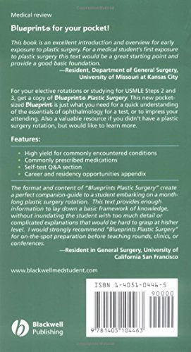 Designed as a quick read for both students on a plastic surgery rotation and others who want to know more about the specialty, Blueprints Plastic Surgery covers the essentials of plastic surgery that every practitioner will need to know.Pocketsized and practical, this book covers the most common conditions students are likely to encounter. It focuses on the essential content students need to know during a rotation allowing for a fast, easy read. Blueprints Plastic Surgery provides an overview of basic techniques, as well as a concise review of the history, pathophysiology, diagnosis, and treatment of common problems facing plastic surgeons.Twentyfive multiplechoice review questions are included to help students test their understanding of the subject. The book also features valuable appendices on career and residency opportunities, and a handy reference list of commonly prescribed medications.Perfect for medical students physician assistants, nurse practitioners and related health professionals will also find Blueprints valuable.