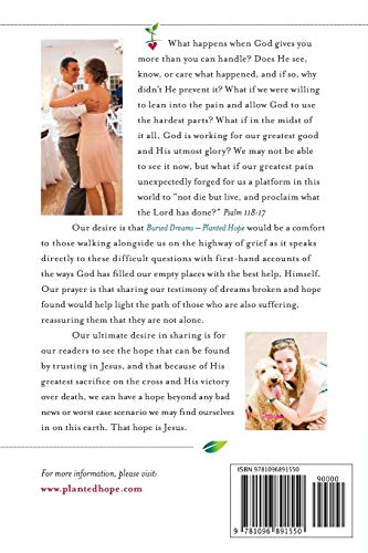 How does one go from planning a wedding to choosing songs for a funeral in a matter of hours? From choosing a wedding venue to discussing organ donation? From dreaming of happily ever after to waking daily to a living nightmare? How does one survive the whiplash and how can loved ones support one who has just entered a tragedy that only happens to someone else? In a unique combination, this daughter and father team tell the story of the birth and sudden death of what was supposed to be a storybook romance. In Buried Dreams Planted Hope, the authors honestly discuss the pain, struggles, support, divine intervention, and emerging hope found on the highway of grief. You will find in this story both an account of one who fought through grief and loss as well as those who have walked this road with her in support. Griever and caregiver alike will find hope and help in this story of tragedy and tested faith. What appears to be a death can actually be a planting. So take heartyou are not alone. You are seen and pursued by a heavenly Father who wants to turn your tragedy into triumph even though you may never find answers to all of your questions. You have not been buried. You have been planted.
