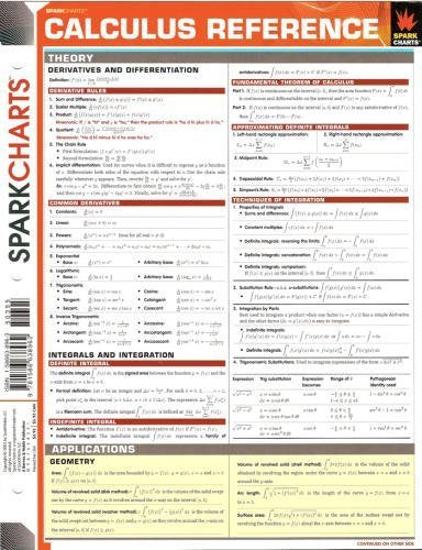 SparkChartsTMcreated by Harvard students for students everywhereserve as study companions and reference tools that cover a wide range of college and graduate school subjects, including Business, Computer Programming, Medicine, Law, Foreign Language, Humanities, and Science. Titles like How to Study, Microsoft Word for Windows, Microsoft Powerpoint for Windows, and HTML give you what it takes to find success in school and beyond. Outlines and summaries cover key points, while diagrams and tables make difficult concepts easier to digest.This twopage chart reviews derivatives and differentiation, integrals and integration. It also covers applications in: Geometry Motion Probability and statistics Microeconomics Finance