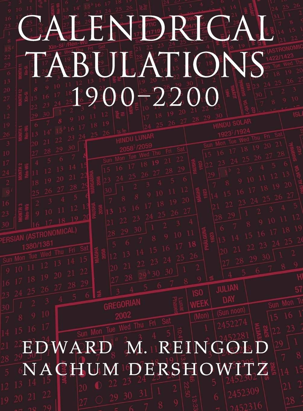This comprehensive collection of calendars could only have been assembled by the authors of the definitive text on calendar algorithms, Calendrical Calculations. Using the algorithms outlined in their earlier book, Reingold and Dershowitz have achieved the near impossible task of simultaneously displaying the date on thirteen different calendars over a threehundred year period. Represented here are the Gregorian, ISO, Hebrew, Chinese, Coptic, Ethiopic, Persian, Hindu lunar, Hindu solar, and Islamic calendars; another three are easily obtained from the tables with minimal arithmetic (JD, R.D., and Julian). The tables also include phases of the moon, dates of solstices and equinoxes, and religious and other special holidays for all the calendars shown. These beautifullyproduced tables will be of use for centuries by anyone with an interest in calendars and the societies that produce them.