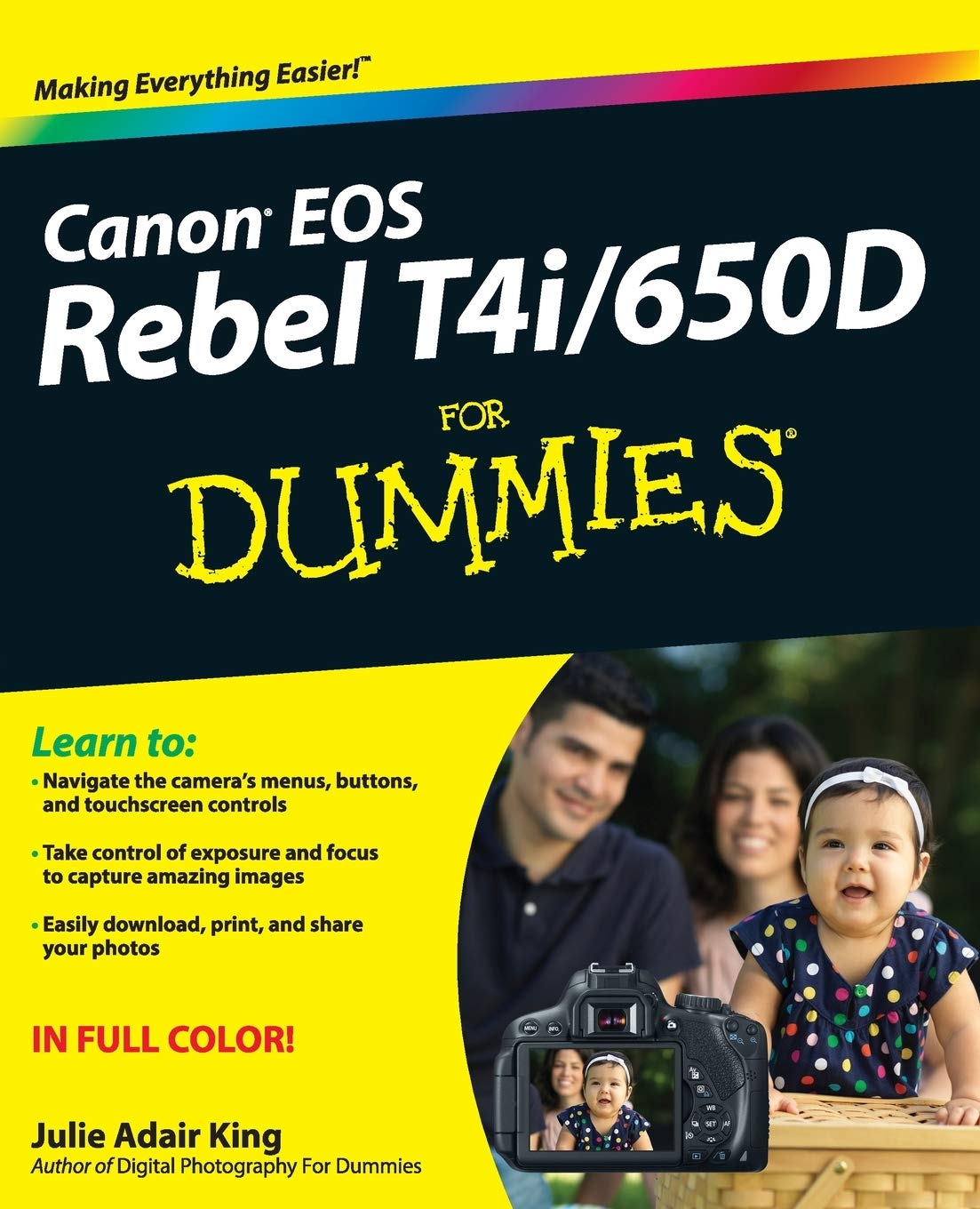 An easytofollow guide to Canon's first touchscreen dSLRCanon calls the EOS Rebel T4i/650D its most consumerfriendly dSLR, but there's still a lot to learn. Expert author and photography instructor Julie Adair King handles the subject in a stepbystep style that will boost your confidence. If this is your first dSLR, you'll find all the information you need to get going with your new camera and start taking great pictures. More than 300 fabulous fullcolor photos illustrate all the camera features and also show you what you and your Rebel T4i/650D can achieve. Canon's EOS Rebel T4i/650D is a consumerfriendly dSLR with touchscreen controls, expanded autofocus features, and improved lowlight shooting capabilities; this friendly guide explains all the controls and helps you gain confidence with the Canon EOS Rebel T4i/650D camera Bestselling author Julie Adair King covers using auto, live view, and playback modes; how to dial in exposure and lighting controls; and how to manipulate focus and color Offers advice on situational shots, explains how to get images onto a computer for editing, and shows how to print photos or post them online Presents professional editing tips and plenty of beautiful fullcolor images showing what you can achieve Popular author has written more than 15 For Dummies books on Nikon and Canon camerasCanon EOS Rebel T4i/650D For Dummies is the perfect howto guide for anyone venturing into dSLR photography with this popular new model.