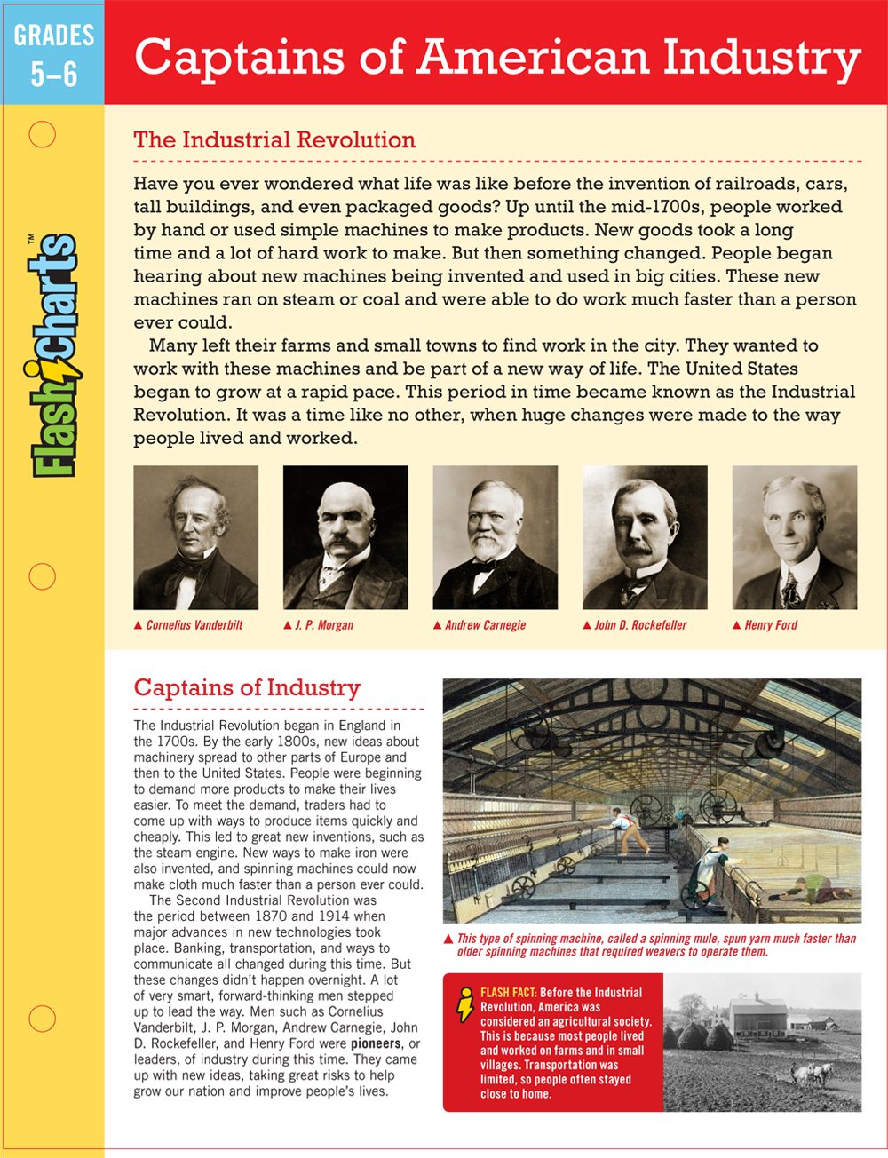 Colorful, laminated FlashCharts condense information into a bright, portable format filled with pictures and diagramsperfect for collecting and carrying anywhere.Who helped build American industry into what it is today? This chart introduces the major names, the captains who built big business in the US. Including such innovators as Cornelius Vanderbilt, Henry Ford, and Andrew Carnegie, this research tool looks at the worldchanging Industrial Revolution and beyond. Perfect for grades 5 and 6.