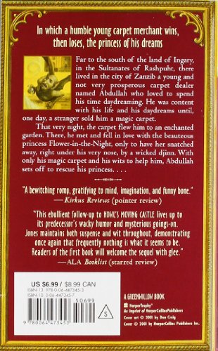 Abdullah was a young and not very prosperous carpet dealer. His father, who had been disappointed in him, had left him only enough money to open a modest booth in the Bazaar. When he was not selling carpets, Abdullah spent his time daydreaming. In his dreams he was not the son of his father, but the longlost son of a prince. There was also a princess who had been betrothed to him at birth. He was content with his life and his daydreams until, one day, a stranger sold him a magic carpet.In this stunning sequel to Howl's Moving Castle, Diana Wynne Jones has again created a largescale, fastpaced fantasy in which people and things are never quite what they seem. There are good and bad djinns, a genie in a bottle, wizards, witches, cats and dogs (but are they cats and dogs?), and a mysterious floating castle filled with kidnapped princesses, as well as two puzzling prophecies. The story speeds along with tantalizing twists and turns until the prophecies are fulfilled, true identities are revealed, and all is resolved in a totally satisfying, breathtaking, surprisefilled ending.