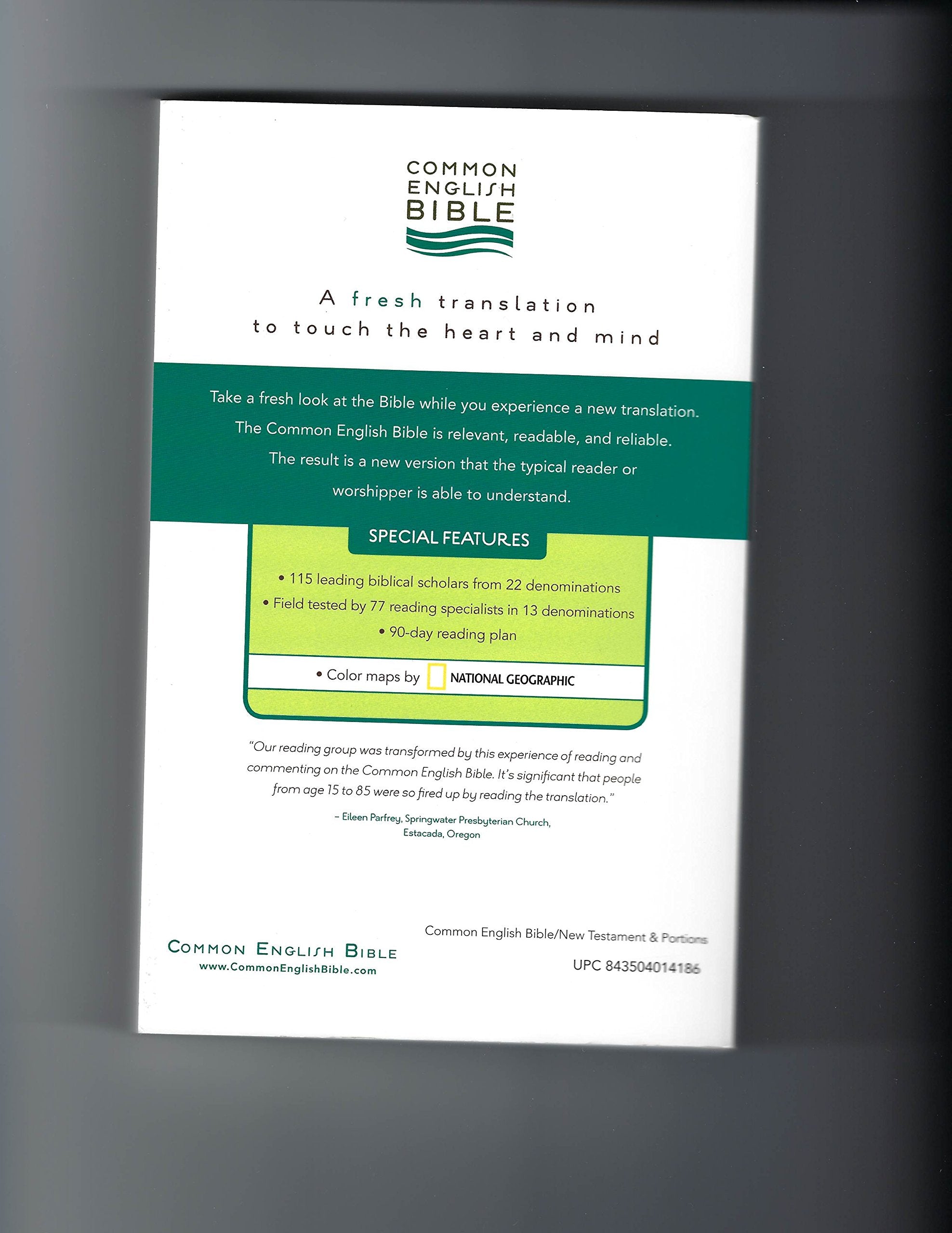 Take a fresh look at the Bible while you experience a new translation. The Common English Bible is relevant, readable, and reliable. The result is a new version that the typical reader or worshipper is able to understand. Available in softcover and premium Decotone bindings.115 leading biblical scholars from 22 faith traditions Field tested by 77 reading specialists in 13 denominations 90day reading plan Single column format Color maps by National Geographic