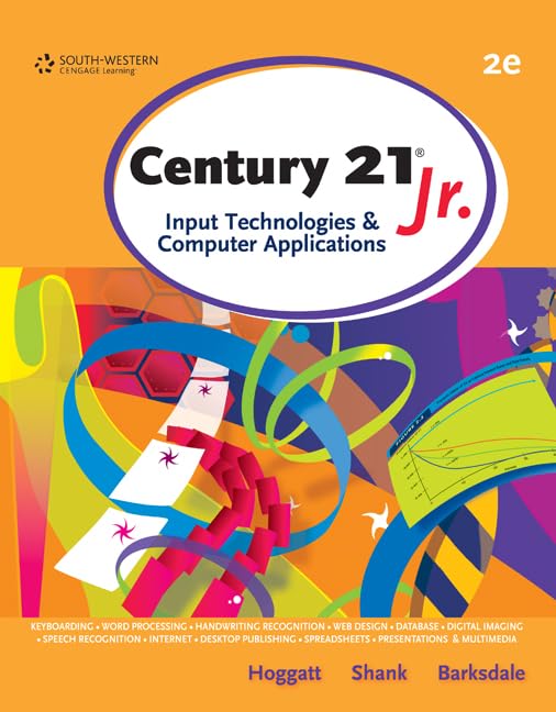 Looking for a solution to get your students started in the computer world? This introductory text, CENTURY 21, JR. INPUT TECHNOLOGIES AND COMPUTER APPLICATIONS, 2e is the perfect companion for navigation of computer basics, file management, the Internet, keyboarding, handwriting recognition, speech recognition, tablet PCs, word processing, desktop publishing, spreadsheets, presentations, databases, HTML programming, and Web pages. CENTURY 21, JR. provides stepbystep guidance, with engaging activities labeled as Learn, Practice, and Apply. Units are divided into easytomanage chapters and projects will help students learn the features of Microsoft Office 2007.