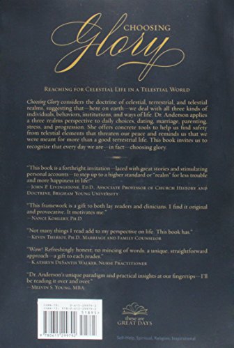 Choosing Glory considers the doctrine of celestial, terrestrial and telestial realms, suggesting that here on earth we deal with all three kinds of individuals, behaviors, institutions, and ways of life. Dr. Anderson applies a three realm perspective to daily choices, dating, marriage, parenting, stress and progression. She offers concrete tools to help us find safety from telestial elements that threaten our peace and reminds us that we were meant for more than a good terrestrial life. This book invites us to recognize that every day we are in fact choosing glory.