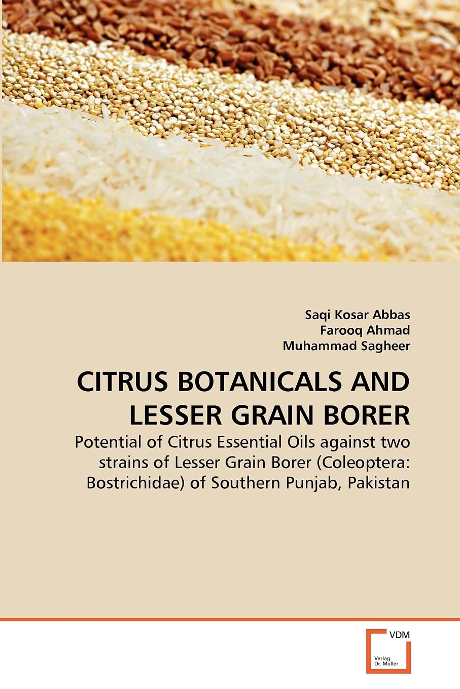 This book describes the Insecticidal activity of essential oils extracted from different citrus varieties, sweet orange, kinnow, bitter orange and grape fruit, at three different concentrations (3%, 6%,12%) was evaluated in the Grain Research Training and Storage Management Laboratory at Department of Entomology, University of Agriculture Faisalabad Pakistan.The Objective of the study was to evalute the insecticidal activity of citrus oils against percent mortality and population buildup of Lesser Grain Borer.The conclusions were withdrawn from the obtained results, maximum mortality was recorded at high concentration.Maximum population build up was recorded in controlled treatment(36.67%), while in treated sample(5.883%). The percent mortality increases with the increased in concentration and the concentration of oils have significant effect on the mortality of Lesser Grain Borer. Population buildup value was found maximum in control treatment than treated but increased in concentration population buildup value was decreased. The results also show that Multan strain are highly susceptible than Vehari strain of Lesser Grain Borer.