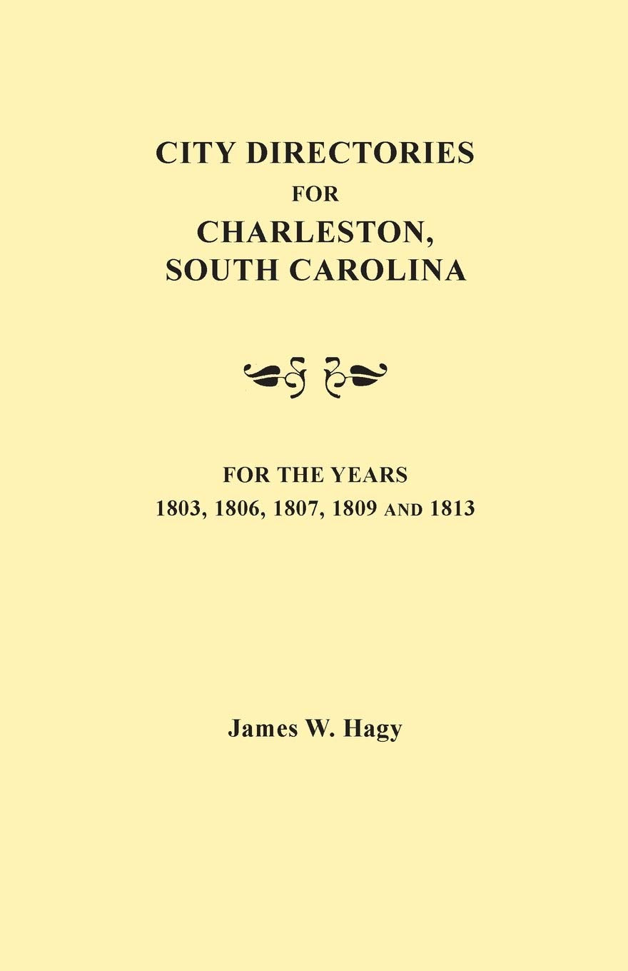 or this new book the author has compiled all the names and other pertinent genealogical information that can be found in the Charleston city directories of 1803, 1806, 1807, 1809, and 1813. The names in each of the five directories are arranged in alphabetical order, obviating the need for an index to the volume as a whole. Typically, the directory entries furnish the name of the Charleston resident, his address, and, in the majority of cases, his occupation. The five directories combined furnish the names and addresses of 15,000 Charlestonians.