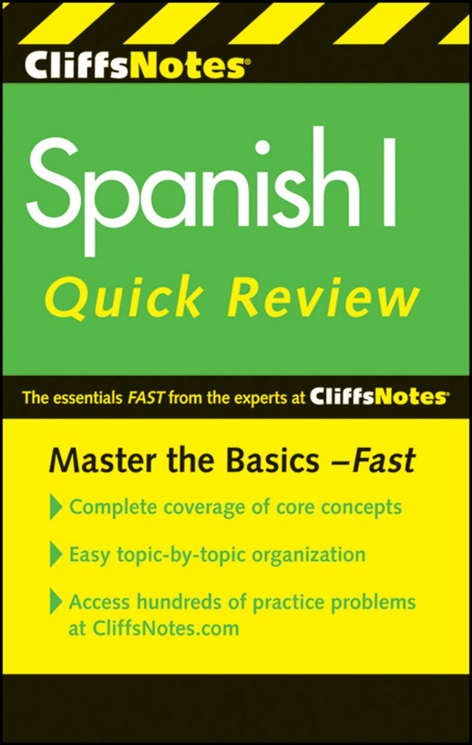 Spelling and PronunciationNouns and ArticlesReplacing Nouns with PronounsInfinitive and Regular Verb UseBasic Sentence StructureIrregular Verbs in the Present TenseAsking and Answering QuestionsAdjectivesAdverbs and ComparisonsDirect and Indirect Object PronounsThe Present TenseThe Imperfect TenseNarration in the PastPrepositionsReflexive, Prepositional, and Demonstrative PronounsCommandsNegativesReview QuestionsResource CenterGlossaryThematic VocabularyVerb ChartsIdiomatic ExpressionsWhy CliffsNotes?Go with the name you know and trustGet the information you needfast!CliffsNotes Quick Review guides give you a clear, concise, easytouse review of the basics. Introducing each topic, defining key terms, and carefully walking you through sample problems, this guide helps you grasp and understand the important concepts needed to succeed.The essentials FAST from the experts at CliffsNotesMaster the Basics FastComplete coverage of core conceptsEasy topicbytopic organizationAccess hundreds of practice problems at CliffsNotes.com
