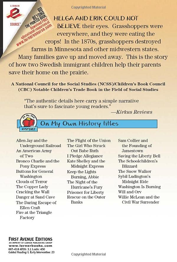 Helga and Erik could not believe their eyes. There were grasshoppers everywhere, and they were eating the crops! In the 1870s, when grasshoppers destroyed farms in Minnesota and other Midwestern states, many families gave up and moved away. This is the story of how two Swedish immigrant children help their parents save their home on the prairie.