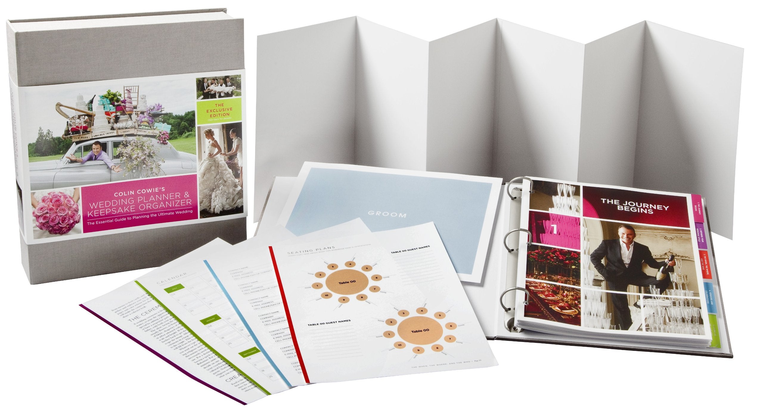 Colin Cowie has a roster of Alist celebrity clientsbut now every modern bride can benefit from his incomparable style, aesthetic, and experience. Designed to work in conjunction with his website, ColinCowieWeddings.com, this beautiful, new threering binderwith illustrations by fashion designer Rebecca Moseswill become the prospective bride's goto planning resource. With Colin's guidance, every bride will succeed in discovering what her own special idea of a dream wedding is and how to make it come true within budget. In addition to covering all the logistics, from creating the guest list to booking a fantasy honeymoon, Colin provides his signature design tips and timetested advice for both bride AND groom. And the bookwhich brides can customize with their very own cover photomakes organization simple and stressfree, thanks to two sturdy storage envelopes, a oneyear calendar, a businesscard holder, seatingchart and guestlist templates, and vendor fillin lists! This gorgeous boxed deluxe edition also includes a bonus mood board and a groom's envelope. Plus, the box turns into a frame for your favorite wedding photo!