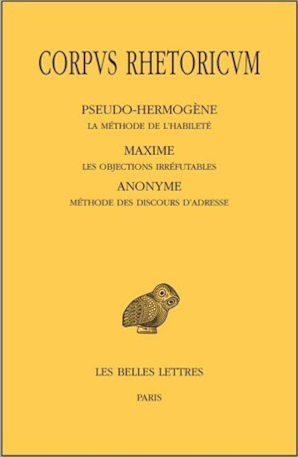 English summary: This is the fifth and final volume of collected ancient Greek texts on rhetoric. Presented here in the original Greek, with French translation, are PseudoHermogenes's On the Method of Speaking Effectively, Maximus Epirota's work on irrefutable objections, and an anonymous treatise on how to address a newly named governor. This final volume includes an index for the entire series. French description: La presente publication constitue le cinquieme et dernier tome de l'edition critique d'un corps de doctrine pour l'enseignement de la rhetorique, rassemble vers la fin du Ve s. ap. J.C. et reste en usage, sous des formes diverses, jusqu'a la fin de la periode byzantine. On a ici les trois derniers des douze textes reunis alors. PseudoHermogene, ..., La methode de l'habilete. Ce curieux texte n'est pas un traite, mais une sorte de thesaurus divise en trentesept chapitres independants concernant notamment la tactique oratoire, les conditions de la communication du sens