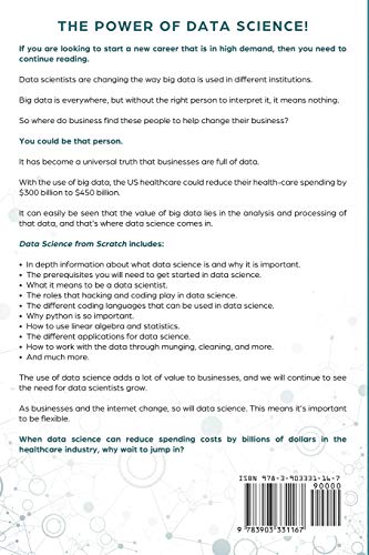 The Power of Data Science!If you are looking to start a new career that is in high demand, then you need to continue reading.Data scientists are changing the way big data is used in different institutions.Big data is everywhere, but without the right person to interpret it, it means nothing.So where do business find these people to help change their business?You could be that person!It has become a universal truth that businesses are full of data.With the use of big data, the US healthcare could reduce their healthcare spending by $300 billion to $450 billion.It can easily be seen that the value of big data lies in the analysis and processing of that data, and that's where data science comes in.Data Science from Scratch includes: Indepth information about what data science is and why it is important. The prerequisites you will need to get started in data science. What it means to be a data scientist. The roles that hacking and coding play in data science. The different coding languages that can be used in data science. Why python is so important. How to use linear algebra and statistics. The different applications for data science. How to work with the data through munging, cleaning, and more.And much more!The use of data science adds a lot of value to businesses, and we will continue to see the need for data scientists grow.As businesses and the internet change, so will data science. This means it's important to be flexible.When data science can reduce spending costs by billions of dollars in the healthcare industry, why wait to jump in?If you want to get started in a new, evergrowing, career, don't wait any longer. Buy this book today.