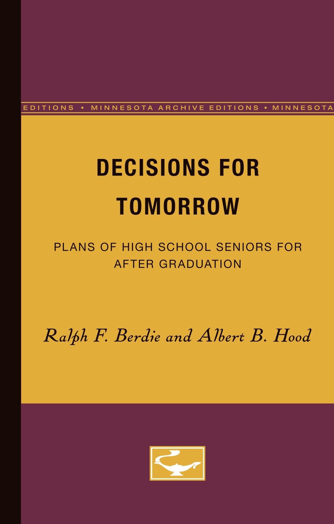 Product Description Decisions for Tomorrow was first published in 1965.The authors surveyed almost the entire population of high school seniors in the state of Minnesota in 1961, some 45,000 young people, in order to study posthighschool plans. The findings of the study are reported here and are compared with findings of a similar survey made a decade earlier. The students were asked during their senior year to provide information about their plans for after graduation, and the eventual behavior of the students was compared with their prediction. Numerous correlations were observed between the students plans and such factors as ability, school achievement, socioeconomic status, and personality. In addition, comparisons were made between the 1950 and 1961 studies to determine whether any observable trends might be attributable to factors as diverse as the orbiting of Sputnik or the increase in number and quality of school counselors.Special emphasis is given to the examination of the collegebound students. Their achievements, aptitudes, and personalities are compared with the same characteristics in youngsters not planning to go to college. However, the authors point out that whether concern is centered on college preparation or on larger questions of manpower, the plans and goals of high school students are of crucial importance in a society which is based on mass education of the highest possible quality.Volume 9 in the Minnesota Library on Student Personnel Work About the Author Ralph F. Berdie was director of the Student Counseling Bureau at the University of Minnesota. His other work includes After High School What? (1954), Counseling and the College Program (1954), Counseling and the Use of Tests (1959), Who Goes to College (1962), and Decisions for Tomorrow (1965), all published by the University of Minnesota Press.