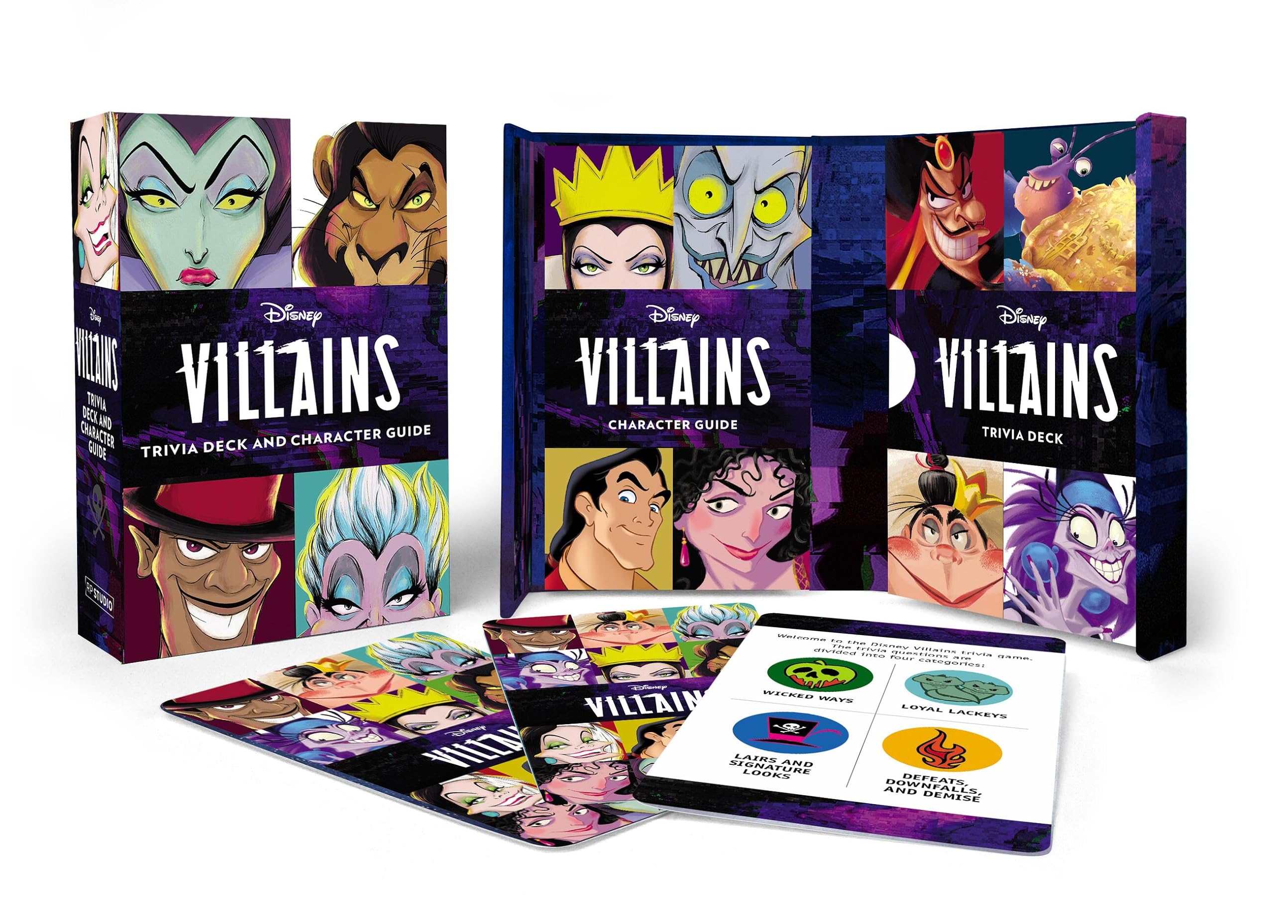 In this officially licensed trivia card game and book set, Disney fans will find all their favorite Disney Villains and enjoy testing their knowledge of Disneys most notorious baddies. Trivia Game: Includes 50 fullcolor printed trivia cards, featuring 200 questions to test your expertise of the Disney Villains Book Included: 88page character guide offers complete profiles of 16 villains, from Cruella de Vil to Mother Gothel, with fullcolor images throughout Great Solo or in Groups: This game works equally well for solo play as it does for groups of 2, 3, or more Gift Box: Packaged in a fullcolor printed magnetic closure box that's perfect for safekeeping trivia cards and book and is sturdy for continued use Perfect Gift: A unique and handsome gift for fans of Disney Villains Copyright 2023 Disney