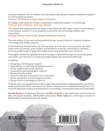 The new edition of this bestselling textbook brings criminological research alive for students. It introduces the processes and practicalities of preparing, doing, experiencing and reflecting upon criminological research. The success of the First Edition has been its ability to contextualize research accessibly within reallife examples of crime, criminology and criminal justice doing interviews with offenders in prison, undertaking evaluation on crime related projects, using questionnaires to measure fear. Its strength continues to lie in its ability to span the process of doing criminological research, helping students to understand the journey of the researcher.