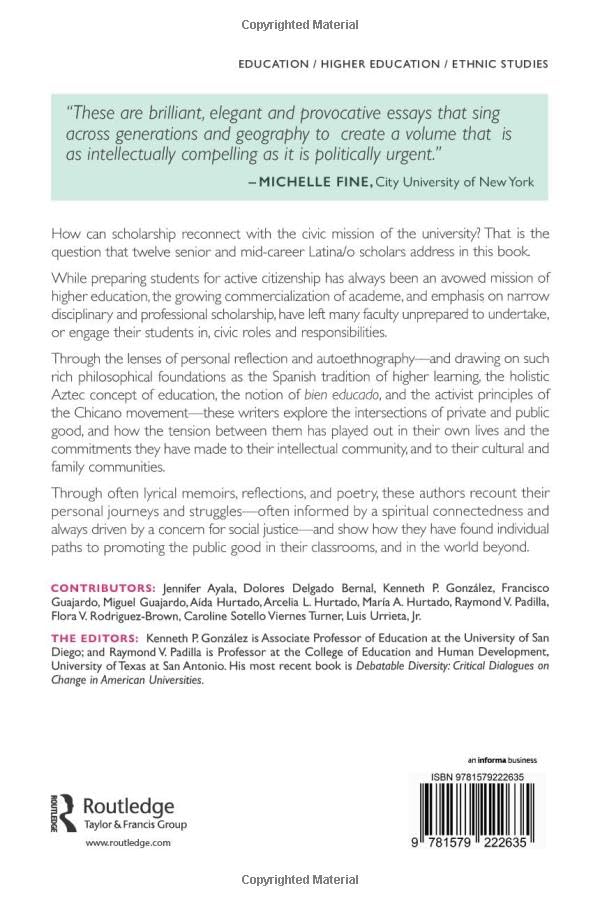How can scholars reconnect themselvesand their studentsto higher educations historic but much diluted mission to work for the public good?Through the lenses of personal reflection and autoethnographyand drawing on such rich philosophical foundations as the Spanish tradition of higher learning, the holistic Aztec concept of education, the Hispanic notion of bien educado, and the activist principles of the Chicano movementthese writers explore the intersections of private and public good, and how the tension between them has played out in their own lives and the commitments they have made to their intellectual community, and to their cultural and family communities.Through often lyrical memoirs, reflections, and poetry, these authors recount their personal journeys and strugglesoften informed by a spiritual connectedness and always driven by a concern for social justiceand show how they have found individual paths to promoting the public good in their classrooms, and in the world beyond.Contributors include: Jennifer Ayala; Dolores Delgado Bernal; Flora V RodriguezBrown; Kenneth P. Gonzales; Miguel Guajardo; Francisco Guajardo; Aida Hurtado; Maria A. Hurtado; Arcelia L. Hurtado, Raymond V. Padilla; Caroline Sotello Viernes Turner; and Luis Urrieta Jr.