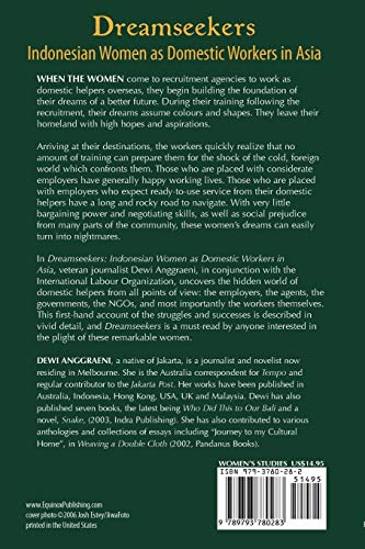 When the women come to recruitment agencies to work as domestic helpers overseas, they begin building the foundation of their dreams of a better future. During their training following the recruitment, their dreams assume colours and shapes. They leave their homeland with high hopes and aspirations. Arriving at their destinations, the workers quickly realize that no amount of training can prepare them for the shock of the cold, foreign world which confronts them. Those who are placed with considerate employers have generally happy working lives. Those who are placed with employers who expect readytouse service from their domestic helpers have a long and rocky road to navigate. With very little bargaining power and negotiating skills, as well as social prejudice from many parts of the community, these women's dreams can easily turn into nightmares.In Dreamseekers: Indonesian Women as Domestic Workers in Asia, veteran journalist Dewi Anggraeni uncovers the hidden world of domestic helpers from all points of view: the employers, the agents, the governments, the NGOs, and most importantly the workers themselves. This firsthand account of the struggles and successes of these women is described in vivid detail, and Dreamseekers is a mustread by anyone interested in the plight of these remarkable women.About the Author Dewi Anggraeni, a native of Jakarta, is a journalist and novelist now residing in Melbourne. She is the Australia correspondent for Tempo and regular contributor to the Jakarta Post. Her works have been published in Australia, Indonesia, Hong Kong, the USA, the UK, and Malaysia. Dewi has also published seven books, the latest being Who Did This to our Bali and a novel, Snake, (2003, Indra Publishing). She has also contributed to various anthologies and collections of essays including "Journey to my Cultural Home", in Weaving a Double Cloth (2002, Pandanus Books).