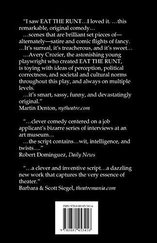 I saw EAT THE RUNTI loved it. this remarkable, original comedy scenes that are brilliant set pieces ofalternatelysatire and comic flights of fancy. Its surreal, its treacherous, and its sweet Avery Crozier, the astonishing young playwright who created EAT THE RUNT, is toying with ideas of perception, political correctness, and societal and cultural norms throughout this play, and always on multiple levels. its smart, sassy, funny, and devastatingly original.Martin Denton, nytheatre.com clever comedy centered on a job applicants bizarre series of interviews at an art museum the script containswit, intelligence, and twists.Robert Dominguez, Daily News a clever and inventive scripta dazzling new work that captures the very essence of theater.Barbara & Scott Siegel, theatremania.com