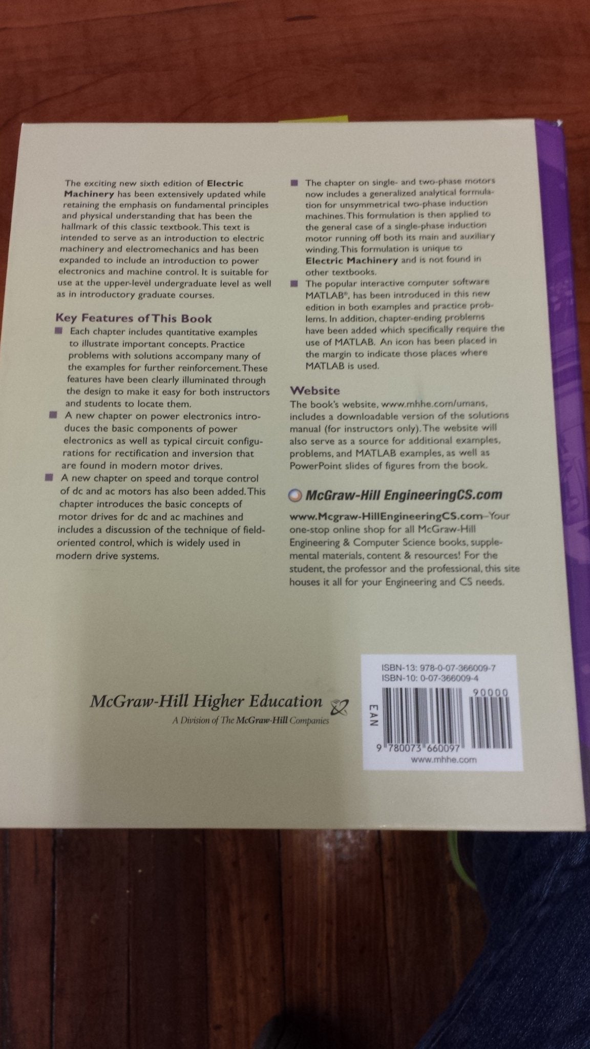 The exciting new sixth edition of Electric Machinery has been extensively updated while retaining the emphasis on fundamental principles and physical understanding that has been the outstanding feature of this classic book.This book covers fundamental concepts in detail as well as advanced topics for readers who wish to cover the material in more depth.Several new chapters have been added, including a chapter on power electronics, as well as one on speed and torque control of dc and ac motors. This edition has also been expanded with additional examples and practice problems. The use of MATLAB has been introduced to the new edition, both in examples within the text as well as in the chapter problems.