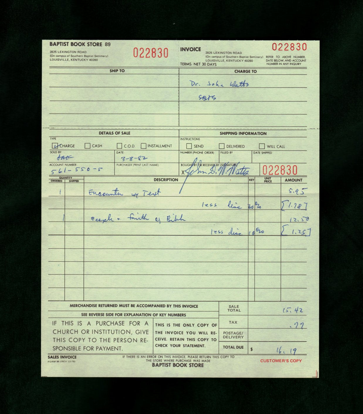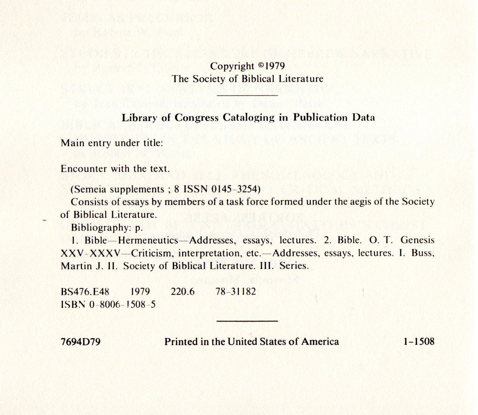 Near Fine very. See scans and description. Philadelphia: Fortress Press, 1979. First Edition. Encounter with the Text: Form and History in the Hebrew Bible, edited by Martin J. Buss. With included ephemera (see below). Octavo, orangered printed wraps, 231 pp. (vii + 224) . Very Near Fine, with two microtouches of edge wear and almost indiscernible spine sunning. Otherwise flawless. See scans. Sharp, bright and tight first edition example, with no interior writing, of this collection of scholarly Old Testament expertise. Include is the original sales slip and receipt, in the name of noted topical luminary the late John D.W. Watts of the Southern Baptist Theological Seminary (see scan of his obituary). These items were found inside this example, and this title (with another) is on the sales slip, hence it was probably his copy, though it is not signed by him. Ships in a new, sturdy, protective box not a bag. LT26