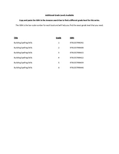 In Building Spelling Skills Daily Practice, Grade 1, students will learn five spelling words per week in lists 114; then eight words per week in lists 1530 (198 total). One or two sentences for dictation are provided for each list.Spelling lists include the following: short and long vowel words adding s and es words with sh, nt, nd sounds of ow, ar, aw, oa present and past tense wordsPractice pages for each unit include the following: a spelling list with spaces to read, write, and spell each word a configuration puzzle for every spelling list word sorting word meaning (filling in missing spelling words in sentences) exercises to find the misspellings and hidden wordsReproducible forms include: spelling record form individual spelling record spelling test form spelling list form word sort form parent letterThis resource contains teacher support pages, reproducible student pages, and an answer key. This is a reproducible resource (photocopying of lessons is permitted) for single classroom or individual home use only.