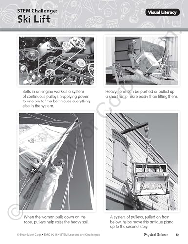 Develop your sixthgrade students creative problemsolving skills with STEM Lessons and Challenges!Students apply science, technology, engineering, and math concepts to solve realworld problems.Every grade 6 unit is focused on a handson challenge and guides students to work together as engineers to design, prototype, test, and refine their creations.Science topics within each unit support Next Generation Science Standards (NGSS) and teach the STEM process. The 15 gradeappropriate STEM challenges target life, earth, and physical science concepts. Every unit is focused on a handson challenge in which students apply the STEM process of plan, create, test, and redesign. Noprep lessons and easytofind materials help you fit STEM learning into the busy school day.Each unit provides everything you need to guide your students in completing the handson challenge, including: Teacher overview pagesTips and directions for preparing students to complete a STEM challenge, as well as a materials list that suggests readily available items to gather. Reading selections for background knowledgeFoundational information that is relevant to the challenge that students are completing. Visual realworld examplesA visual literacy page with realworld images relevant to the STEM challenge. A STEM challenge overviewIntroduces the specific task and goal of each STEM challenge and provides space for students to brainstorm. Design process worksheetsActivities guide students to plan, create, test, and evaluate their creation. A redesign page to evaluate their designThe worksheet guides students through each step of the design process and provides space to document plans, materials, results, evaluations, and revisions.Examples of STEM challenges and science topics from grade 6 include: EggLaying Box (Life Science Concept: Simple Machines (inclined plane) Submarine (Earth Science Concept: Buoyancy) Projector (Physical Science Concept: Optics)This resource contains teacher support pages and reproducible student pages. An answer key is not included, since there isnt one correct answer or solution to solve the problem or complete the challenge. This is a reproducible resource (photocopying of lessons is permitted) for single classroom or individual home use only.About EvanMoorA leader in PreK8 educational publishing, EvanMoor has been a trusted partner of teachers and parents for over 40 years. Our mission is helping children learn, and we do this by creating resources that motivate children to learn important skills and concepts across the curriculum while also inspiring a love of learning.