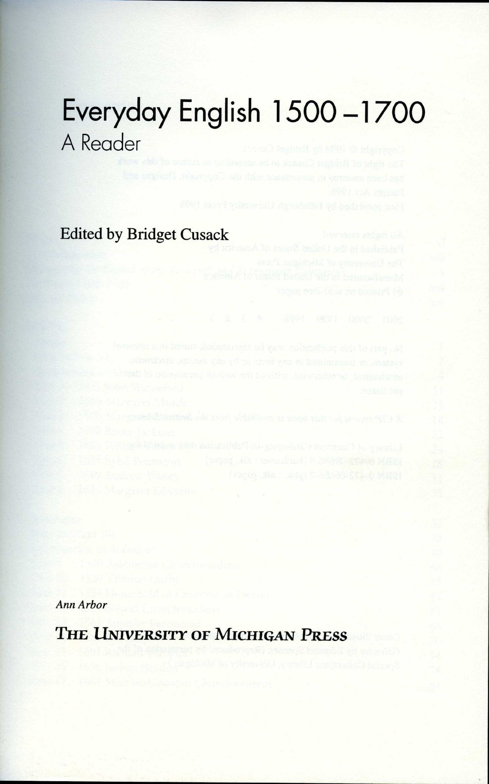 What kind of language did ordinary men and women use in the seventeenth century? Everyday English 15001700 addresses this question by bringing together and explaining more than sixty nonliterary texts from the early modern period, ranging from witnesses' depositions to church wardens' accounts, and from letters and journals to constables' presentments and scurrilous abuse shouted in the marketplace.This unique source book of essential documents designed for courses on Early Modern English is designed as a teaching text with full guidance to each text, including glossary, explanatory and background notes, and suggested topics for linguistic evaluation. Everyday English takes an uptotheminute approach by focusing on language as it was used and spoken at the time.This wideranging collection for the first time makes available to students a corpus of examples of the ordinary, nonstandard language of the man and woman in the street, coming from areas as diverse as England, Scotland, and America. The emphasis throughout is on providing as much assistance as possible to the reader to aid understanding and appreciation of both the linguistic features and the everyday lifestyles of the time.'The only book a really conscientious teacher of the history and structure of Early Modern English would use for source texts.' Roger Lass, University of Cape TownBridget Cusack was lecturer in English Language, University of Edinburgh.