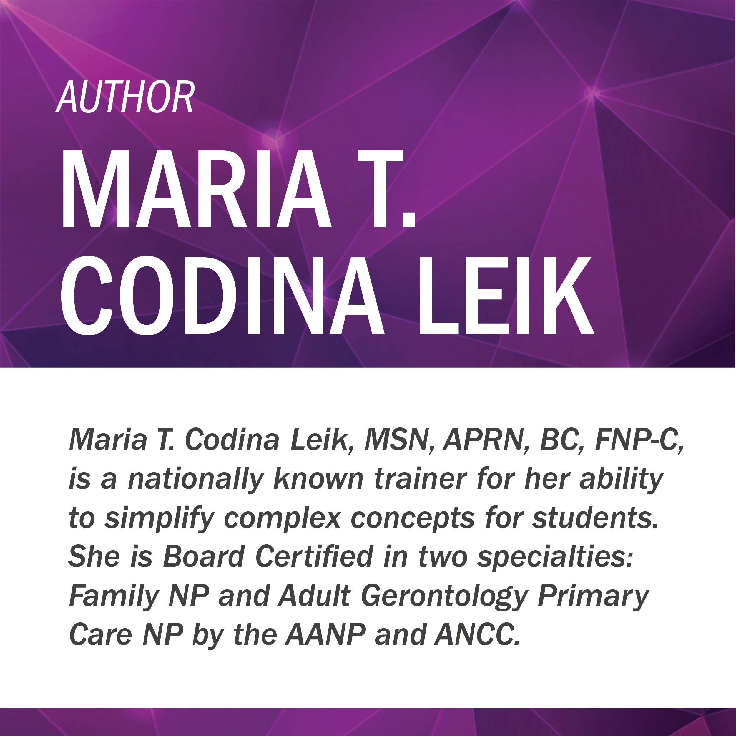 - Q: Who is the author of the book? A: The book is authored by Maria T. Codina Leik, MSN, ARNP, FNP-C, FNP-BC, AGPCNP-BC.
