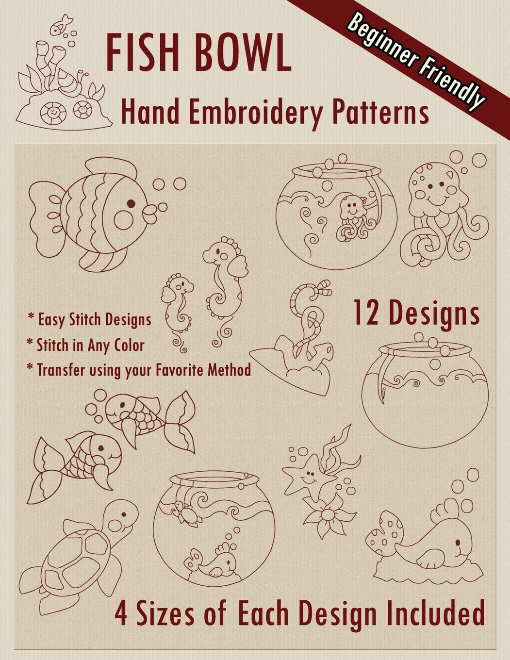 Hand embroidery patterns of 12 adorable fish and aquariums.Designs are beginner friendly and consist of straight stitches only. All you need to do is transfer to your fabric using your favorite method and start stitching!Our embroidery patterns are designed in the 'redwork' style, but feel free to use your creativity to explore other colors to match your project.Each design is provided in 4 sizes ranging from about 3 inches to approximately 78 inches.Use your imagination to create your own projects ranging from quilts to pillow covers to wallhangings and more!Also included are a few basic embroidery tips, but a basic embroidery knowledge is helpful