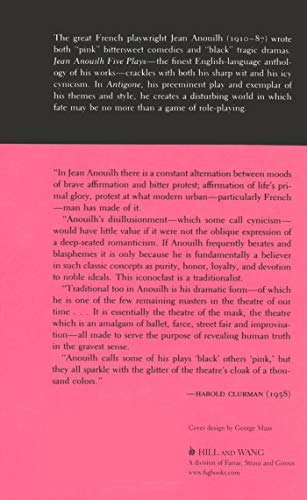 The great French playwright Jean Anouilh (191087) wrote both "pink" bittersweet comedies and "black" tragic dramas. Jean Anouilh Five Playsthe finest Englishlanguage anthology of his workscrackles with both his sharp wit and his icy cynicism. In Antigone, his preeminent play and exemplar of his themes and style, he creates a disturbing world in which fate may be no more than a game of roleplaying. Eurydice, The Ermine, The Rehearsal, Romeo and Jeannette are the other plays included in this edition.