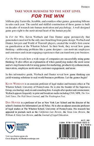 Take your business to the next levelfor the winMillions flock to their computers, consoles, mobile phones, tablets, and social networks each day to play World of Warcraft, Farmville, Scrabble, and countless other games, generating billions in sales each year. The careful and skillful construction of these games is built on decades of research into human motivation and psychology: A welldesigned game goes right to the motivational heart of the human psyche.In For the Win, authors Kevin Werbach and Dan Hunter argue persuasively that gamemakers need not be the only ones benefiting from game design. Werbach and Hunter are lawyers and World of Warcraft players who created the world's first course on gamification at the Wharton School. In their book, they reveal how game thinkingaddressing problems like a game designercan motivate employees and customers and create engaging experiences that can transform your business.For the Win reveals how a wide range of companies are successfully using game thinking. It also offers an explanation of when gamifying makes the most sense and a 6step framework for using games for marketing, productivity enhancement, innovation, employee motivation, customer engagement, and more.In this illuminating guide, Werbach and Hunter reveal how game thinking can yield winning solutions to realworld business problems. Let the games begin!