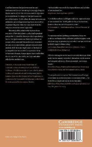 Conflicts between foreign investment law and environmental law are becoming increasingly frequent. On the one hand, the rise of environmental regulation poses significant challenges to foreign investors in several industries. On the other, the surge in investment arbitration proceedings is making States aware of the important litigation risks that may result from the adoption of environmental regulation. This study of the relationship between these two areas of law adopts both a policy and a practical perspective. It identifies the major challenges facing States, foreign investors and their legal advisers as a result of the potential friction between investment law and environmental law and provides a detailed analysis of all the major legal issues on the basis of a comprehensive study of the jurisprudence from investment tribunals, human rights courts and bodies, the ICJ, the WTO, the ITLOS, the CJEU and other adjudication mechanisms.