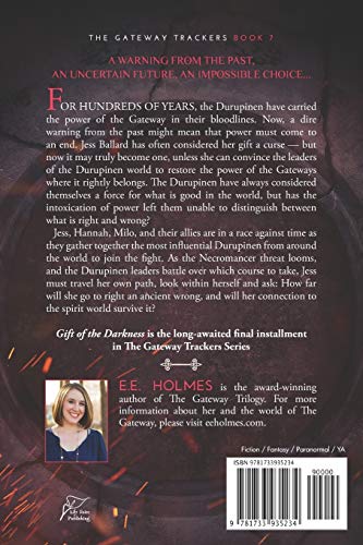A warning from the past, an uncertain future, an impossible choice...For hundreds of years, the Durupinen have carried the power of the Gateway in their bloodlines. Now, a dire warning from the past might mean that power must come to an end. Jess Ballard has often considered her gift a curse but now it may truly become one, unless she can convince the leaders of the Durupinen world to restore the power of the Gateways where it rightly belongs. The Durupinen have always considered themselves a force for what is good in the world, but has the intoxication of power left them unable to distinguish between what is right and wrong?Jess, Hannah, Milo, and their allies are in a race against time as they gather together the most influential Durupinen from around the world to join the fight. As the Necromancer threat looms, and the Durupinen leaders battle over which course to take, Jess must travel her own path, look within herself and ask: How far will she go to right an ancient wrong, and will her connection to the spirit world survive it?Gift of the Darkness is the highlyanticipated final installment in The Gateway Trackers series by E.E. Holmes.