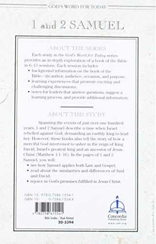 Spanning the events of just over one hundred years, 1 and 2 Samuel describe a time when Israel rebelled against God, demanding an earthly king to lead her. However, these books also tell the story of how a merciful God intervened to usher in the reign of King David, Israel's greatest king and an ancestor of Jesus Christ (Matthew 1:116). In the pages of 1 and 2 Samuel, you will: see how God's last judge, Samuel, applies both Law and Gospel; read about Saul and David, remarkably different individuals but remarkably the same; rejoice in God's promises made to David that are fulfilled in his descendant and our Savior, Jesus Christ.