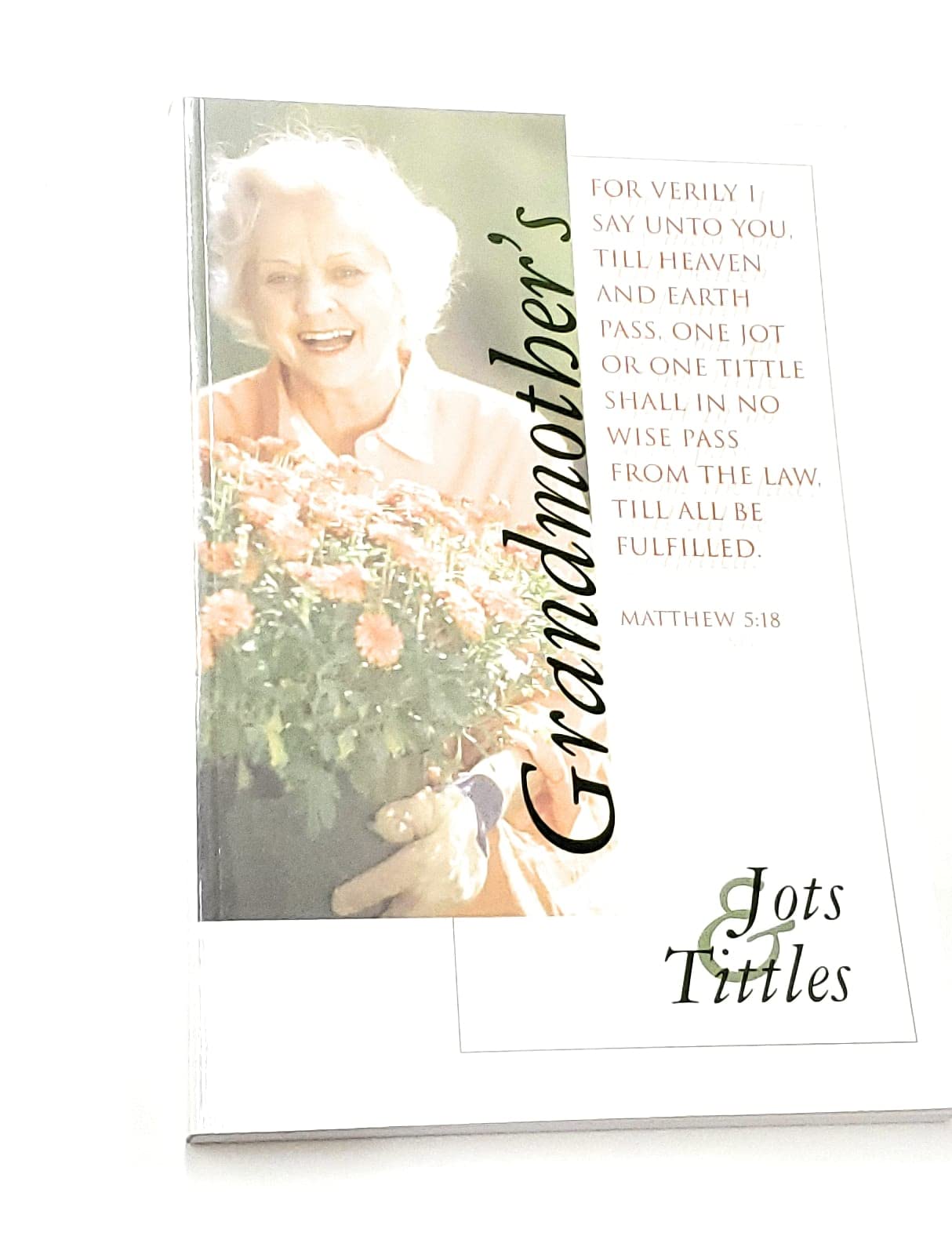 A personal lined journal for Grandmothers. A treasure for her family to enjoy for years to come. "For verily I say unto you, till heaven and earth pass, one jot or one tittle shall in no wise pass from the law, till all be fulfilled" is the subtitle for this lovely journal.